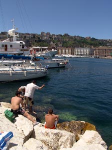 La scialuppa attraccò al piccolo molo, una pariglia di sei scugnizzi napoletani agghindati da Pulcinella, corse ad infilare collane di fiori e banane al collo dei regali esuli. Fili-bertuccio non sapeva se annusare o mangiare quel dono ma lo gradì moltissimo e volle baciare i sei pulcinella ma questi, in un residuato bellico d'orgoglio patrio nonostante la squallida comparsata, si rifiutarono perché "gli uomini tra loro non si baciano o sono femminielli", così predicava la saggezza popolare.Dal piccolo molo d'attracco, gli esuli stavano per salire sulla banchina del nautico Savoja quando uno scroscio d'applausi e di urla e di fiori-proiettile cui non erano abituati, li fece esitare un tantino. "Viva 'o Rre!", si levò un vocione..Viva 'o Rre! Gridò la folla; il Borbone col piattino in mano, impassibile, pestava i piedi alla suocera che scalpitava e lo pregava di far qualcosa per trarsi d'impiccio con un po' di autorità che gli derivava dal suo titolo di autentico principe del Sud...ma lui continuava a sorridere, bello e di gesso, come un manichino della Rinascente. La fanfara dei bersaglieri prese ad intonare Flic e Floc e tutti iniziarono festosamente a saltare sulla banchina,, ospiti, autorità, personale di servizio, sangiovannare...eppure il busto di San Gennaro. Non appena i piedi regali infilarono i primi gradini della scaletta di legno, per salire alla piattaforma del circolo Savoja, dall'alto di Pizzofalcone, come un rombo di tuono arrivò una gittata di pizze Margherita sparate dal Cannone - una tonnellata circa - accompagnata da un sonoro spernacchiamento, che tutto distrusse. Le lanterne cinesi, gli addobbi floreali, Flic e Floc, i Savoja, il biondo platino della Jervolino, i balconcini delle vajasse, Bassolino, il filosofo De Crescenzo,......i tifosi del Calcio Napoli, sartù di riso e sotè di vongole, trombe, scetavajasse, pinzillacchere e putipù,...i sei pulcinella, i principi di Borbone, i murattiani, le caccavelle.....i tricolore sabaudi,..pure quel povero San Gennaro.Tutto! Tutto e tutti massacrati da franamenti continui di mozzarella, pomodoro e basilico bollenti. Una strage! I sabaudi, impauriti, non trovando più ormeggiata la scialuppa reale, si fiondarono nella Gondolona tutta d'oro di Venezia ed a forza di braccia la spinsero al largo, verso la salvezza. Intercettarono la fregata "FREGATA" kuwaitiana e chiesero asilo politico, giurando di non voler mettere mai più piede in Italia, mentre la cantante Gloriana, imperterrita, urlava nel microfono "Torna, 'sta casa apettà a tte!". I fieri Luciani si erano intanto dispersi per la città, imprendibili. La notte prese a calare. Rimase sulla banchina del nautico Savoja solo Pasqualino 'o pazzo, piangendo calde lacrime : "E mò, chi se l'accatta cchiù 'o Calcio Napoli? E' la fine! E' la fine!". ***** Ecco, questo ho sognato stanotte,